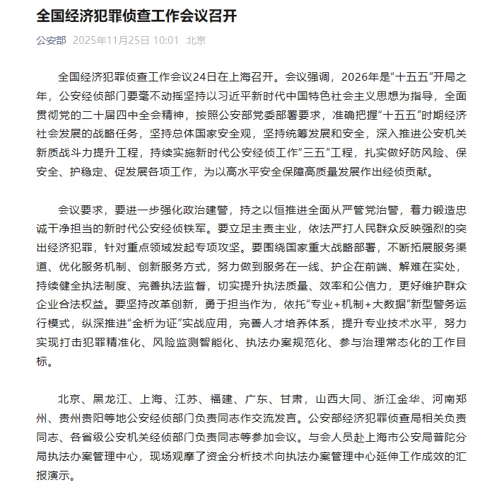 全国经济犯罪侦查工作会议24日在上海召开。会议强调,2026年是“十五五”开局之年。公安经侦部门绝不能以习近平新时代中国特色社会主义思想为指导,全面贯彻落实党的二十届四中全会精神,按照公安部扩党要求的要求,准确把握“十五”期间经济社会发展的战略任务。要坚持国家安全总体观,坚持发展与安全协调,深入推进公安机关公务素质提升新质量提升,继续实施新时代经侦公安“三五”工程,做好扎实做好防范风险、保安全、保稳定、促发展工作,为查处经济作出贡献,确保高安全高质量发展。会议要求,进一步加强警察政治建设,持续推进全面从严治党治警,努力打造廉洁、廉洁、责任的公安侦查铁军新时代。要聚焦重点责任和重点业务,依法严厉打击群众反映强烈的已知经济犯罪,对重点领域开展专项打击。要围绕国家重大战略部署,不断拓展服务渠道、优化服务机制、创新服务方式,努力服务一线、保护企业前端、解决落地问题,持续完善法律法规完善执法监督体系,切实提高执法质量、效率和公信力,更好保护群众企业合法权益。我们要不断改革变革,勇于担当,依靠“专业+机制+大数据”的警务新运作模式,深入推进“金分析为证据”的实际运用,完善人才培养体系,提高专业技术水平,努力实现打击犯罪精准化、佩里格智能监控、执法办案规范、管理正常参与的目标。北京、黑龙江、上海、江苏、福建、广东、甘肃、山西大同、浙江金华、河南郑州、贵州固阳等地公安经侦部门负责同志在交流会上发言。有关同志公安部经济犯罪侦查局有关负责人及公安机关经济侦查部门负责同志参加会议。与会人员前往上海市公安局普陀分局执法案件管理中心,现场观摩了资金分析技术在案件管理中心拓展成效的汇报和演示。微信公众号截图